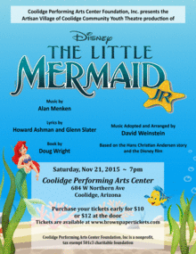 The Little Mermaid Jr.,a Disney and classic story by Hans Christian Andersen, is brought to the Coolidge Performing Arts Center stage by the Artisan Village of Coolidge Community Youth Theater. This will be the premier performance for this artisan troop and it is first of many programs planned. The date is Saturday, November 21, 2015.