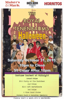 Hey friends! It's that time again. This year we are getting our dysfunction on with a Royal Tenenbaum themed Halloween Party this year. Hornitos and Maker's Mark drink specials and themed food all night long.
