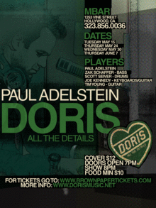 |  | EventPaul Adelstein's  DORIS: ALL THE DETAILSDoris is the musical outlet for songwriter,composer, and actor Paul Adelstein. The bands'latest studio album All The Details, co-produced by Adelstein and musical director Zoux (Macy Gray, RunDMC), is full of eclectic influences crossing musical boundaries from Wurlitzer-infused pop jingle to acoustic guitar-laced rock passages with sweeping vocal harmonies. Ranging form heartfelt contemplation to folk storytelling to sympathetic satire, the piano-driven album features 10-tracks of authentic Randy Newman-esque and Harry Nilsson-styled compositions.