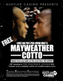 Watch the exciting Mayweather VS Cotto fight live at Hustler Casino Los Angeles. There is NO COVER charge to watch from any gaming table on the main floor!