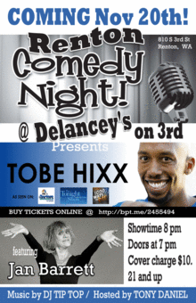 Friday November 20th-Renton Comedy Night-TOBE HIXX w/NW LEGEND-JAN BARRETT