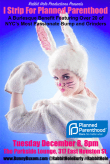 Tuesday December 8 at the Parkside Lounge, celebrate the one year anniversary of Rabbit Hole Productions and help raise money for an important organization in need with 2 hosts and over 20 performers. I Strip for Planned Parenthood is an evening of empowered striptease for a cause!