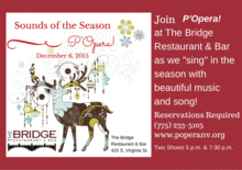 Plan to ring in the holiday season as P'Opera! presents its "Sounds of the Season" on December 6, 2015 at The Bridge Restaurant & Bar. One of Reno's best-loved groups, "P'Opera!", will fill your senses with the its vocal artistry. Performing classic Christmas carols, traditional Hanukkah songs, audience sing-alongs, a cappella arrangements, large ensemble pieces, and solos the artists will get you into the holiday spirit with their memorable performance. Take a break from the hustle & bustle and plan now to make The Bridge your destination as P'Opera! proudly presents "Sounds of the Season".