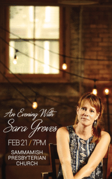 Come join us at Sammamish Presbyterian Church (SPC) for a special evening on Sunday, February 21 at 7pm with mom, wife, and critically acclaimed singer/ songwriter Sara Groves! Sara's songs are sonic vignettes of struggle and hope, racing and resting, joy in the midst of traversing hardship, honesty when wrestling with hard questions, and, in turn, evoke a feeling of coming home after a long journey. You will not want to miss this! Sara has been nominated for 7 Dove Awards and has produced a string of poignant recordings including her latest, FLOODPLAIN. Doors open at 6pm | 22522 NE Inglewood Hill Rd., Sammamish, WA 98074.