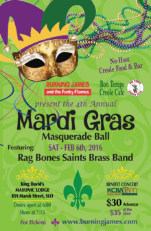 February 6th at the SLO Masonic Lodge; Burning James and the Funky Flames and Bon Temps Creole Cafe present a funky good time to benefit KCBX Public Radio