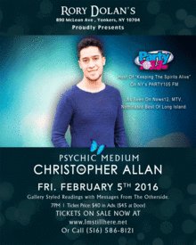 Join renowned Psychic Medium Christopher Allan for a night in the afterlife Feb. 5h at the famed Rory Dolan's in Yonkers, NY. He will be sharing specific & healing validations from your friends & family who have crossed over to the Otherside with his signature quick wit & compassion. Christopher is host of "Keeping The Spirits Alive" on New York's Party105 FM & was the feature of an MTV documentary television show "I Have Paranormal Ability". He was awarded the Giver Of Hope Award by The American Cancer Society. This will be a heartwarming night to remember! Celebrate life with the afterlife.