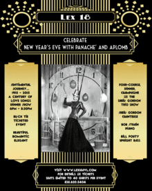 8:30pm 1:30am Reception, Dinner, Show & Celebration Includes: A wild vintage cocktail punch reception A Classic 1920s Hollywood song, dance & magic variety show Chef Townsend's five-course dinner (menu below) Complimentary champagne for toast Viewing of televised ball drop in New York City Après midnight chocolate and savory nosh & nibble plate Après midnight music for dancing till close Framed vintage stylized personal photo of you and guest A Special Gift from Lex 18 $145/pp (sales tax and gratuity is not included) $165/pp for high top window seats, 4 person minimum