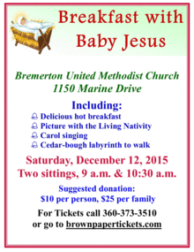 A wonderful way to pause in the middle of the busyness of the season, breathe deeply, and put our focus on the real meaning of Christmas! Come enjoy a delicious hot breakfast, have your picture taken with the Holy Family in our Living Nativity, walk a cedar-bough labyrinth, and sing Christmas carols. And goody bags for the kids! We offer a choice of two sittings: 9:00 and 10:30.
