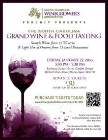 The NC Grand Wine & Food Tasting will be held Friday, January 22nd, 2016, 5:30 pm to 7:30 pm in the Garden Terrace of the Embassy Suites Hotel, 460 North Cherry Street, Winston Salem, NC 27101.