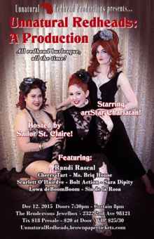 When Scarlett O'Hairdye first launched Unnatural Redhead Productions she had one goal: To bring quality, nerd-friendly burlesque to the people of Seattle. Having achieved that goal with sold-out shows about everything from board games to 80's cartoons, she set out on a second goal: To find as many unnatural redheads as she could and bring them all together into one fire-headed extravaganza bent on world domination! That show is Unnatural Redheads: A Production! Striptease artists from all walks of life and bringing all kinds of performance styles are united under the scarlet wig of destiny! Settle in to your seat or booth, enjoy a drink or a snack brought to you during the show, and let's get ready for redheads!