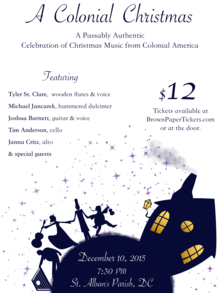 Join us for a wonderful night of music, revelry and history as we celebrate Christmastide, Colonial American-style! We'll play music, we'll talk about history, and we'll bring the story of early American Christmas to life in all of its drunken, rowdy glory.