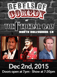 It's Rebels of Comedy at the Federal Bar in North Hollywood. Come out and see a night of live comedy, featuring an awesome lineup of professional features and headliner comedians. Hosted by Teddy Tutson with Headliners Josh Levesque, Keith Nelson
