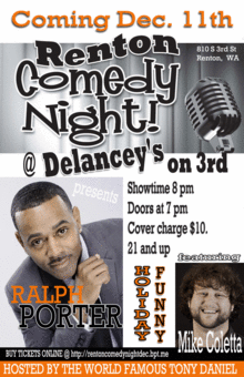RCN returns with RALPH PORTER a Local Legend who is doing big things nationally. From Chicago to California is he making a name for himself with appearances on BET and SHOWTIME. We also have Mike Coletta a high energy rising star fresh from THE BLANKET FORT COMEDY TOUR! Once again DeLancey's on 3rd hosts a night of comedy and music! Boasting a full drink and bar menu, DeLancey's is Downtown Renton's #1 party spot! Seattle DJ TIP TOP plays all the hits before and after the show. There is plenty of free parking downtown Renton. HOSTED BY TONY DANIEL