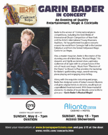 Also, a master magician, Bader is the creator of the stunning one-of-a-kind show, "Musical Magic." His dynamic and highly acclaimed show captivates audiences of all ages with its unique fusion of the arts of music and magic. Music from "Phantom of the Opera" to Mozart to Pop provides the backdrop for Bader's spellbinding magic, award-winning piano playing and engaging story-telling.
