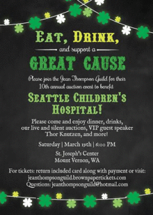 Our guild has been raising funds for Seattle Children's Hospital for more than 30 years! Please join us for our 10th annual auction event. You'll enjoy our live and silent auctions, raffle prizes, games, dinner, drinks, and a touching experience as our VIP guest Thor Knutzen shares his experiences at the hospital. We will have all this fun while at the same time helping the families and patients at Seattle Children's Hospital! There are many opportunities to give in all denominations throughout the night, and funds raised help the uncompensated care fund at Seattle Children's. We look forward to spending the evening with you!