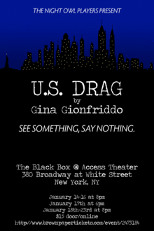 'U.S. Drag', by Gina Gionfriddo, follows two young women trying to scheme their way through Manhattan while trying to figure out what it means to matter in a modern day society. Along the way they volunteer for a community advocacy group whose objective is to catch an elusive serial attacker named 'Ed' who is roaming the streets of the city...