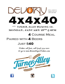 The Devotay 4x4x40 Dinner Series rolls on! Join Turner Alley Brewing and Devotay for 4 carefully selected beers paired with 4 plates from Devotay Executive Chef Daniel Knowles. Turner Alley will guide you through each of the beers, their ingredients and styles, and Chef Daniel will explain the choices behind each of the pairings. Reservations are required, Purchase from BrownPaperTickets.com or call 319.354.1001.