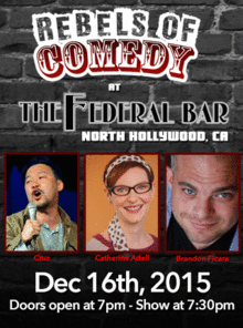 It's Rebels of Comedy at the Federal Bar in North Hollywood. Come out and see a night of live comedy, featuring an awesome lineup of professional features and headliner comedians. Hosted by Cruz with Headliners Catherine Adell and Brandon Ficara