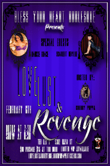 February is just around the corner! And while that month is normally attributed to cutesy cards and candy chocolates, there's much more to explore below the surface when in comes to matters of the heart. Back for another stunner of a show, the ladies of Bless Your Heart Burlesque are pleased and teased to present: Love, Lust, and Revenge. We're busting out all-new acts that celebrate every aspect of human nature, from the sweet... to the sexy... to the slightly sadistic.
