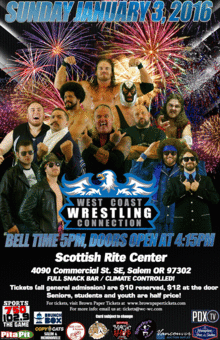 The West Coast Wrestling Connection returns to the Scottish Rite Center in Salem, OR, Sunday January 3rd. First bell is at 5pm, doors open at about 4:00pm.