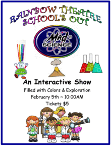 "Preschool 123s of Science". This interactive show is filled with colors! See how chemistry can blow up a balloon, mix together potions to make a rainbow and see foam come bubbling out of a cup. We'll explore sound and vibration with our thunder tube, and even hear dry ice "talk". Join us for this fun entertainment on Friday February 5, 2016. The performance is at 10:00am in the Slayton House Theatre in the Village of Wilde Lake in Columbia. Tickets may be purchased for $5 at Slayton House. Tickets may also be purchased online at brownpapertickets.com keywords "Rainbow Theatre". For information call 410-730-3987. Sponsored by Wilde Lake Community Association.