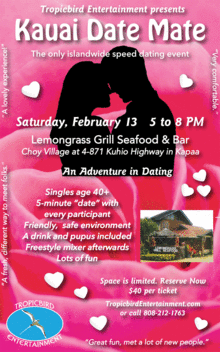 Hosted by Tropicbird Entertainment, Kauai Date Mate's speed dating event is the perfect way for singles age 40-plus to meet each other.