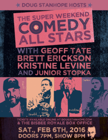 Doug Stanhope will host the Annual Super Weekend Comedy All Stars in Bisbee, AZ on Saturday, Feb. 6th at 8pm with 4 of his favorite national headlining comedians. Scheduled to perform are Geoff Tate, Brett Erickson, Kristine Levine and Junior Stopka. Lineup may change without notice.