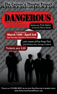 Directed by Comapny Artist Mason Absher. Playing the role of Alexandar Valmont will be TCTP's Artistic Director Marc James joining him are Company Aritist Rocco Renda as Rosemonde, Rounding out the cast Cory Lipman as Trevor, Leo LaCamara as Landon,Justin Dietzel as Jason, Joe Faifer as Daniel and Shane Roberie as Marcus Dangerous will be presented at The Prop Thtr March 10th-April 3rd No Perfromances on March 31st and April 1st 3502 N Elston Ave Chicago IL 60618 Thurs,Fri,Sat @ 8pm Sun @ 3 Tickets at $20.00
