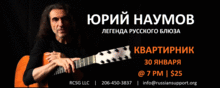 Yuri Naumov (Russian: Юрий Леонидович Наумов, born May 3, 1962, Sverdlovsk, USSR) is a poet, composer, singer and acoustic guitar player, a unique Russian bluesman. In January 1983 Naumov formed a band named Prokhodnoy Dvor, the line-up of which also included Vladimir Zotov (drums) and Oleg Kurokhtin (guitars). Soon, after a bootleg released by the band became popular in the USSR, KGB forced Naumov to leave Novosibirsk Medical University for "promulgation of decadent western values," and he sought safety first in Leningrad and later in Moscow. In 1990 Naumov moved to New York, United States.