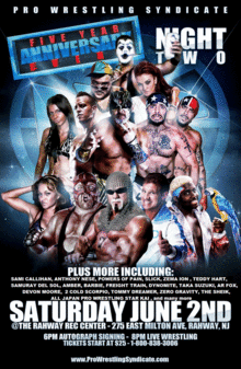 Pro Wrestling Syndicate Five Year Anniversary Event Night Two on Saturday June 2 at The Rahway Rec Center on 275 East Milton Ave in Rahway, NJ.