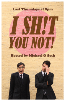 I SHIT YOU NOT! is a live, monthly storytelling show and weekly podcast featuring comedians, storytellers and regular people sharing true and embarrassing tales (often dealing with failed restraint and bodily blunders). Since its inception in 2012 the show has set itself apart from other live-lit and comedy shows by giving audiences a one-of-a-kind storytelling experience and was even named "Best Storytelling Series" by The Chicago Reader in 2015!