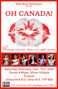 We have pulled together a stellar cast to pay tribute to our neighbors to the north! Why spend February 13th at another awkward , boring, "romantic" event pretending you enjoy Valentine's day when you can watch us nip out from the frigid Canadian air and celebrate a bullshit holiday made up by the Canadians to get a day off of work!!!