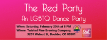 You're invited to join Out Boulder for our annual Red Party on Saturday, February 20, 2016 from 8pm to 11pm at Twisted Pine Brewery in Boulder!