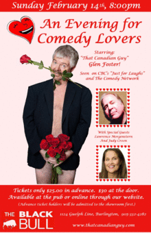 Valentine's Day falls on a Sunday this year and Monday is a holiday (Family Day in Ontario) So treat that special (or not so special) person in your life to a great evening of laughs with myself and two of the funniest people I know. Lawernce Morgenstern and Judy Croon