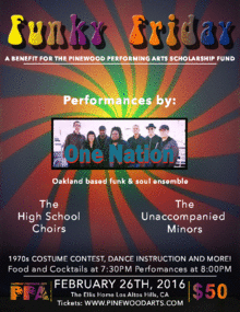 This 1970s Funk Themed Dance Party will feature Oakland-based funk/soul 9-piece ensemble ONE NATION with special performances by Pinewood School's high school choirs and student ensembles.