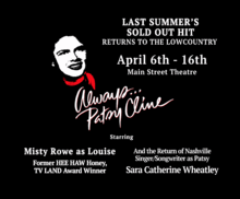 The musical play, complete with down home country humor, true emotion and even some audience participation, includes many of Patsy's unforgettable hits such as Crazy, I Fall to Pieces, Sweet Dreams and Walking After Midnight, 27 songs in all. The show's title was inspired by Cline's letters to Seger, which were consistently signed "Love ALWAYS Patsy Cline."