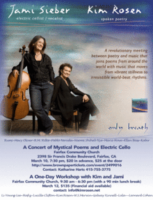 Thursday, March 10, 2016 ~ Fairfax, CA Join Kim in concert with musical alchemist, Jami Sieber on electric cello A Poetry Concert. For more information call The Center for Embodied Spirituality and producer, Katharine Harts at 415-755-3775 or www.soullovesthebody.com