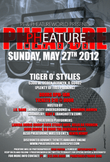 Sunday, May, 27th 2012 Venue: Tiger O' Stylies 6300 W. Ogden Berwyn, IL 60402 (Plenty of Free Parking) Doors 8pm-1am Tickets $10 @ Door Discounted Advance tickets available online www.pheatureonline.blogspot.com Pheatured Performers: Ladeda Music Group & The BackYard Muts, Rock Steady Boys, Rello Da Youngin, Hard Knock, So Hood Also Pheaturing Wasted Ent's Kenya Henry