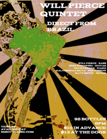 Will is back at 98 Bottles, and this time he is bringing the sounds of Brazil with him. Come enjoy music composed by Antonio Carlos Jobim and Hermeto Pascoal among other Brazilian greats. Featuring Matt Smith on drums, Mike Borowski on Guitar, Devin Penner on Keyboards, and Halysson da Silva on percussion.