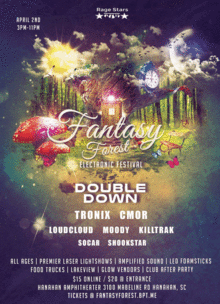 Introducing the 1st annual electronic dance event to take place on a forest plantation at the Hanahan amphitheater. This rave is the perfect time for spring breakers from school & all over to come out in full force. Having a premier production, amplified sound, & colorful stage lighting through the woods will make you feel like you're in a world where it is nothing but a fantasy of fun, bass, & colors. This will be our biggest event of the spring. Invite all your friends to the page & wait for the madness to begin!