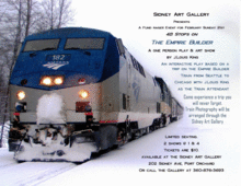 Join us at the Sidney Art Gallery and Museum for our February fundraiser - an interactive, one man play and art show by Photographer J. Louis King based on a trip aboard the Empire Builder, a train trip from Seattle to Chicago. 48 stops with Louis as your train attendant. Train photography will be arranged through the Sidney Art Gallery. Your conductor will be Photographer J. Louis King. Seating is limited and there will be two shows, one starting at 1:00 pm and one starting at 4:00 pm on Sunday, February 21, 2016.