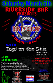 Utah Based AC/DC Tribute Band DIRT/CHEAP is making its first appearance in Idaho. Saturday night March 5th 2016 Join us at The Riverside Bar in Burley Idaho for a night of ROCK & ROLL. Joining them on stage will be Southern Idahos Favorite DOG'S ( DOGS on the LAM) the name says it all!!!