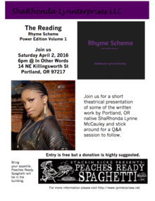 Join us for a short theatrical presentation of some of the written work by Portland, OR native ShaRhonda Lynne McCauley, and stick around for a Q&A to follow. The event is free but purchasing your ticket secures your copy of Rhyme Scheme: Power Edition Volume 1.