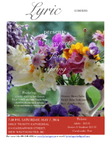 From the same folks who brought you the Boar's Head dinners at Christmas for so many years -- This concert performed by Lyric Singers, directed by Nancy Rahn, with pianist Betty Suderman, and bass player Jonathon Worst, will feature a wide variety of different types of music. A jazz mass by Bob Chilcott, a beautiful composition, "In the Beginning," by Imant Raminsh and several old favourite folk tunes made famous by Peter, Paul & Mary, as well as several other pieces [;both sacred & secular]; will thrill the listener. The acoustics and the beautiful setting at Holy Trinity Cathedral will only enhance this wonderful experience on what will likely be a beautiful Spring evening! For a truly moving musical experience at an affordable price without having to fight Downtown traffic do NOT miss this concert! We look forward to your support.