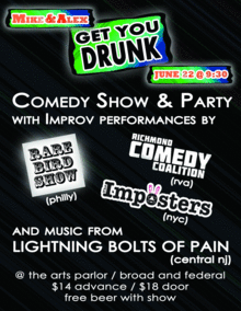 Mike Hochman and Alex Gross like two things a lot. Beer and Improv. This show gives you both. With performances from Philly's RARE BIRD SHOW (with guest Maggy Keegan), RICHMOND COMEDY COALITION up from Virginia, and THE IMPOSTERS down from NYC. plus music from comedy band LIGHTNING BOLTS OF PAIN.