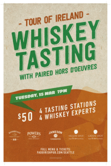 In honor of St. Patrick's Day, join us for a meal of whiskeys & Guinness from Ireland with Official Jameson Whiskey Ambassadors on Tuesday, March 15th at 7:00 pm. . Tickets are $50/each and available for purchase at http://fadojamesondinner.brownpapertickets.com