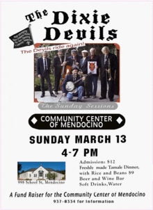 Enjoy the swinging music and a dinner of handmade tamales, rice and beans, plus local beer and wine. The Dixie Devils are Bob Ayres (clarinet), Kevin Burke (drums), Richard Karch (bass), Steve Paul (trumpet), Bill Adams (piano), Eric Wik (trombone), and Jan Jakob (banjo). Formed in 2007, the Dixie Devils band plays music from the early Louie Armstrong era. Many of the historic tunes are played at Mardi Gras festivals, and are named after colorful New Orleans establishments and landmarks, including: Mahogany Hall Stomp, Saints Go Marching In, Mardi Gras Mambo, Royal Garden Blues, St. James Infirmary, Avalon, Dr. Jazz, Basin Street Blues, Weary Blue and Millenberg Joys.