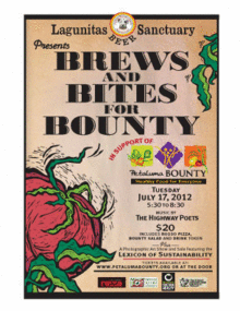 Local music by the Highway Poets, Rosso's pizza, Bounty Farm salad, Lagunitas beer, wine, and The Lexicon of Sustainability photography exhibit, all at our favorite local brewery - Lagunitas Brewing Company's Beer Sanctuary. Proceeds benefit Petaluma Bounty's programs to make healthy and affordable food available to everyone. Kids under 6 are free.