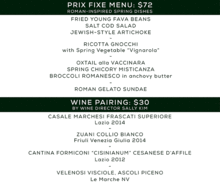 FRIED YOUNG FAVA BEANS SALT COD SALAD JEWISH-STYLE ARTICHOKE - RICOTTA GNOCCHI with Spring Vegetable Vignarola - OXTAIL alla VACCINARA SPRING CHICORY MISTICANZA Broccoli romanesco in anchovy butter - ROMAN GELATO SUNDAE