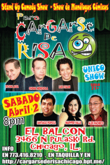 Con la genial participacion de Jose Maria "CHEMA" Mendiola, Alex Pacheco, Luis Stalin, Santiago Popoca, MaryFer Valle y Eytan Lasca. Dirigida por Max Da Silva, viajaras al Mundo de la Risa; donde te garantizamos que te vas a Cargar de la Risa...